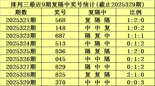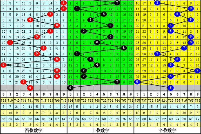 最近9期陈列三组选号码复隔中统计 复码走势为:1-1-1-0-1-0-0-2-0,共开出6个; 隔码走势为:2-0-1-1-2-1-1-1-0,共开出9个; 中码走势为:0-2-1-2-0-2-2-0-3,共开出12个; 本期号码复隔中比例参考1:1:1。 百位分析:百位最近9期出号:5-1-6-5-8-0-8-8-3,奖号012路比为3:1:5,大小比为6:3,奇偶比为4:5,本期百位参考号码489。 十位分析:十位最近9期奖号为:6-4-8-1-3-4-2-2-7,奖号大小比为3:6,奇偶比为3:6,012路比为2:4:3,本期十位柔和号码078。 个位分析:个位最近9期奖号为:8-8-7-3-6-5-9-5-0,奖号012路比为4:1:4,大小比为7:2,奇偶比为5:4,本期个位柔和号码058。